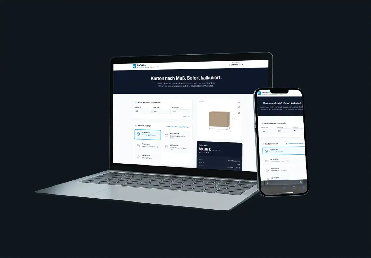 Konfiguriere Maße, Bauform und Material sieh den Karton als 3D-Vorschau und erhalte sofort eine saubere Kalkulation. Ideal für Verpackungshersteller, Vertrieb und Einkauf.